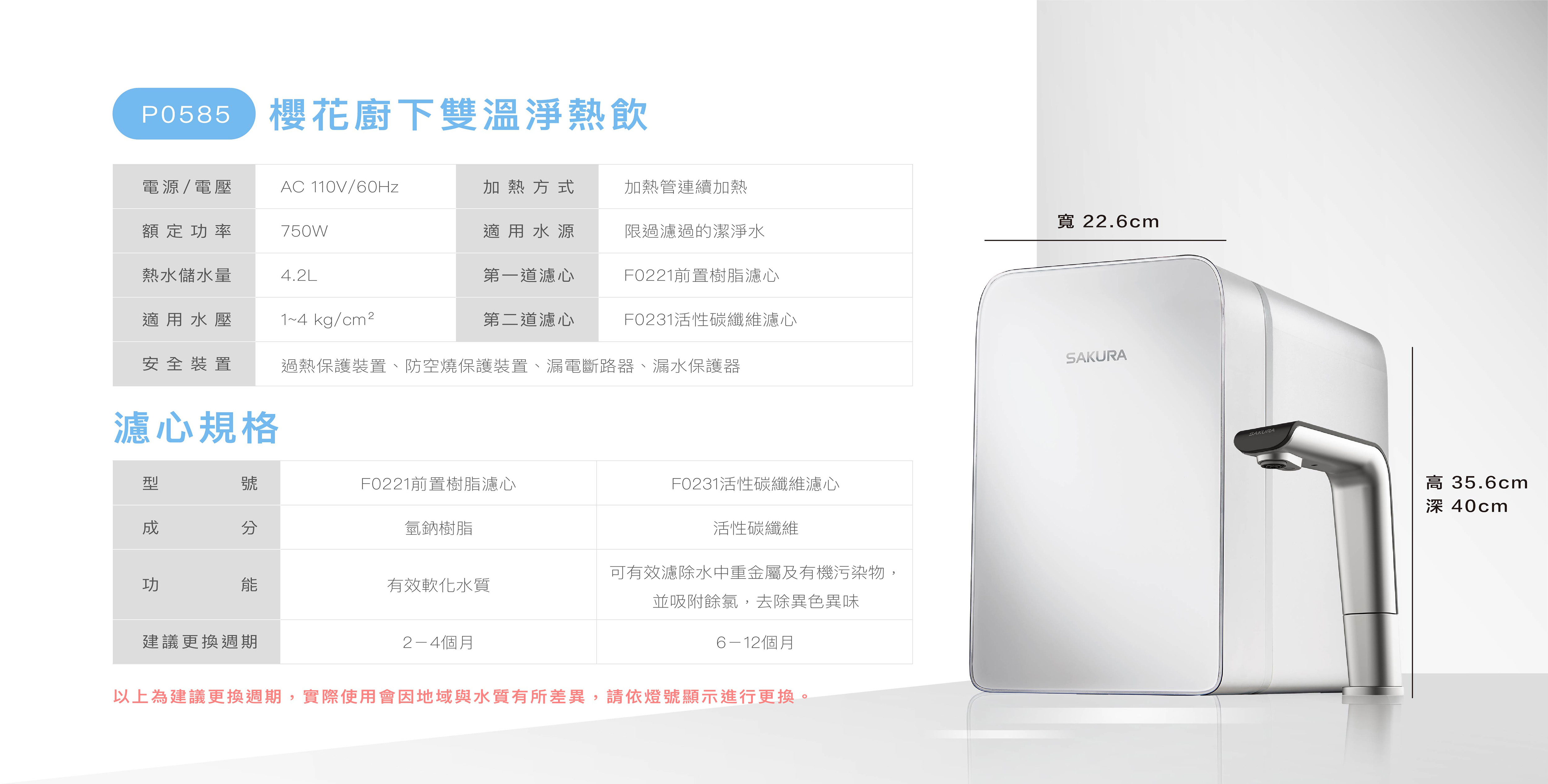 主機尺寸(寬*高*深) 226*356*400mm 額定電壓 110V/60Hz 額定功率 750W 適用水壓 1~4 kg/cm2 適用溫度 5~38℃ 熱水儲水量 4.2L 熱膽材質 SUS 304 加熱管材質 SUS 316 過濾方式 2道式 第一道濾材 (建議更換週期) 前置樹脂濾心 (2~4個月) 第二道濾材 (建議更換週期) 活性碳纖維濾心 (6~12個月) 安全裝置 過熱保護裝置